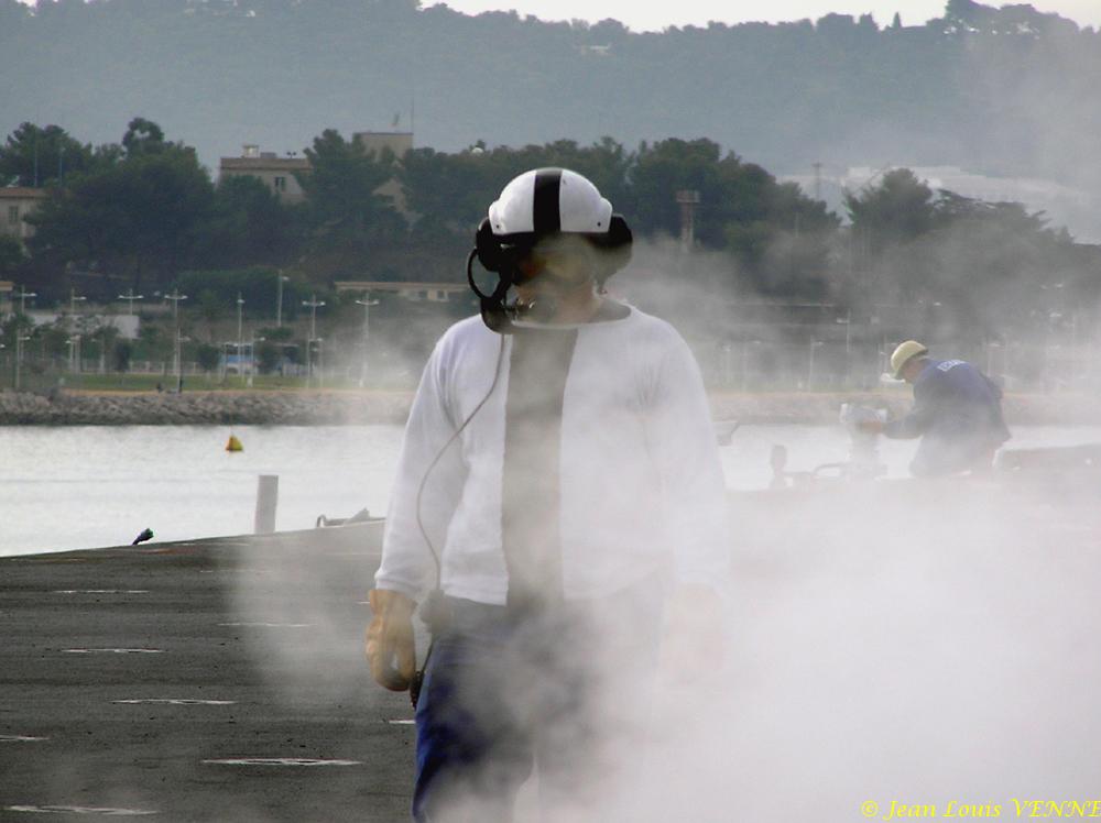 Deuxième semaine des essais de catapultes sur le porte-avions Charles de Gaulle. Pour chacune des 2 catapultes, ce ne sont pas moins de 28 essais qui doivent être effectués, dans diverses configurations de poids et de vitesse.