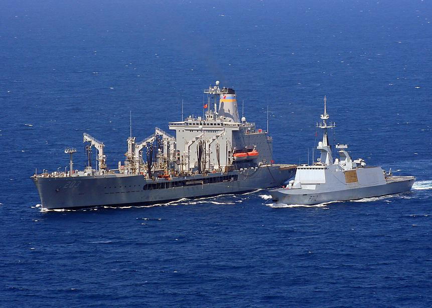 Le pétrolier USNS Laramie, un navire de la flotte auxilliaire de l’US Navy (Military Sealift Command), a rempli les cuves de la frégate.