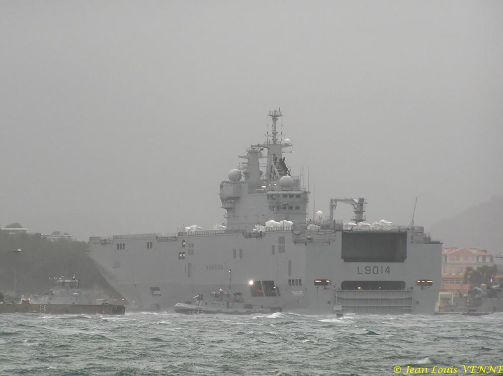 La surface exposée au vent d’un BPC se comporte comme une voile. A partir d’une certaine vitesse de vent, les aussières peuvent ne plus suffire à retenir le bâtiment. C’est la raison pour laquelle, ce dimanche, au plus fort de la tempête qui soufflait sur Toulon, on a pu voir 2 remorqueurs de la base navale venir épauler le Tonnerre et le maintenir à quai.