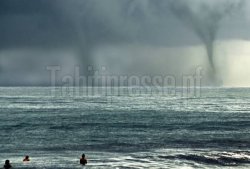 "C’est la première fois que je vois çà !" indique Jérôme Vivier qui, par la photo, témoigne des séries de trombes marines observées ces derniers jours à Tahiti et à Moorea. Celles-ci ont été photographiées sur la côte Est de Tahiti, face au spot de surf de Papenoo. "Elles se formaient par séries de trois ou quatre" conclut cet observateur.