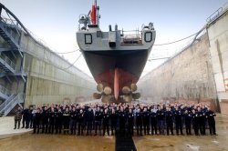 A La Réunion, le chantier naval Piriou débute avec le bâtiment de soutien Champlain un premier arrêt technique sur le dock flottant