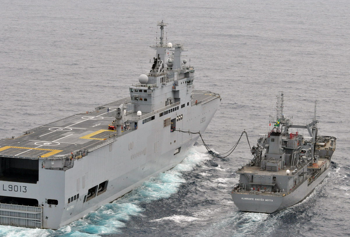 Voici des images d’un ravitaillement à la mer (RAM) au cours duquel un pétrolier de la marine brésilienne, le Gastão Motta, transfert du combustible au bâtiment de projection et de commandement (BPC) Mistral, de la Marine Nationale.