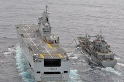 Le bâtiment ravitailleur de forces Jacques Chevallier ravitaille la frégate espagnole Mendez Nuñez