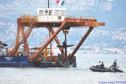 Le 22 juillet dernier, le navire Castor 02 s’est installé devant l’école de plongée de la marine nationale à St Mandrier pour relever des ancres et chaînes posées sur le fond, qui avaient servi pour l’embossage de la Rance et du Cdt Rivière.