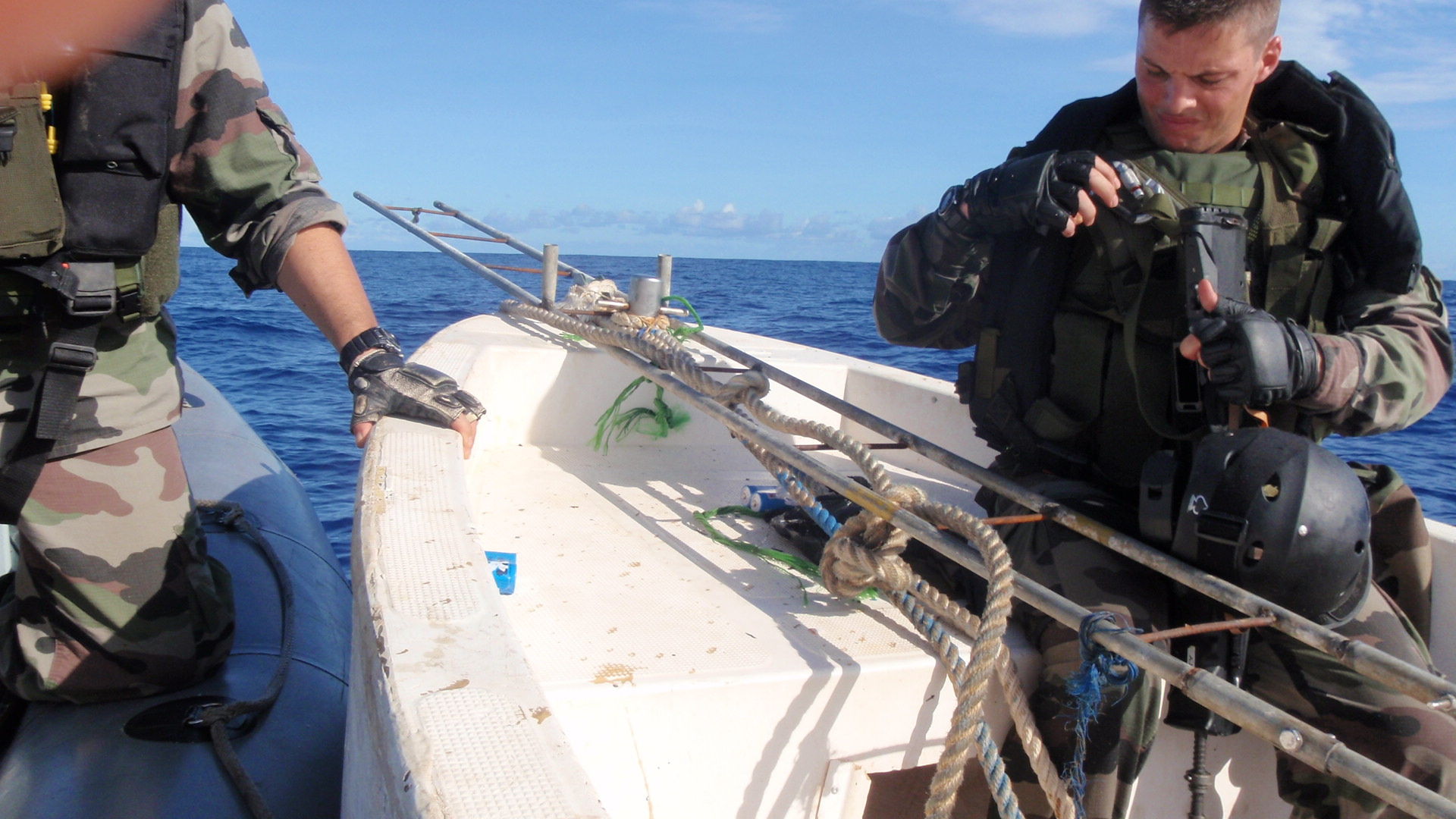 Lorsque les pirates présumés ont réalisé que les forces de lutte contre la piraterie s’approchaient, ils ont commencé à jeter des armes et une échelle par dessus le bord. Cette dernière a été récupérée par l’équipage de l’hélicoptère.