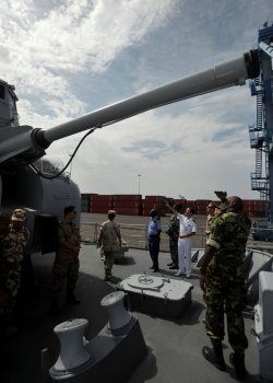 Le Lieutenant Colonel Sultan Ebu de l’armée éthiopienne (à gauche) et le Captain Daniel Muvaa de l’armée kényane (2è à partir de la gauche) écoute le lieutenant de vaisseau Loïc Boyer, qui leur fait visiter la passerelle du Dupleix. © Larry Foos / US Navy
