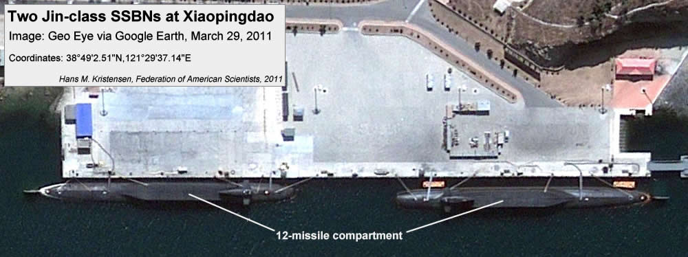 Deux SNLE chinois de la nouvelle classe Jin ont été photographiés à Xiaopingdao à la fin mars 2011, peut-être pour être préparés pour un essai de lancement de missiles. © Federation of Americain Scientists