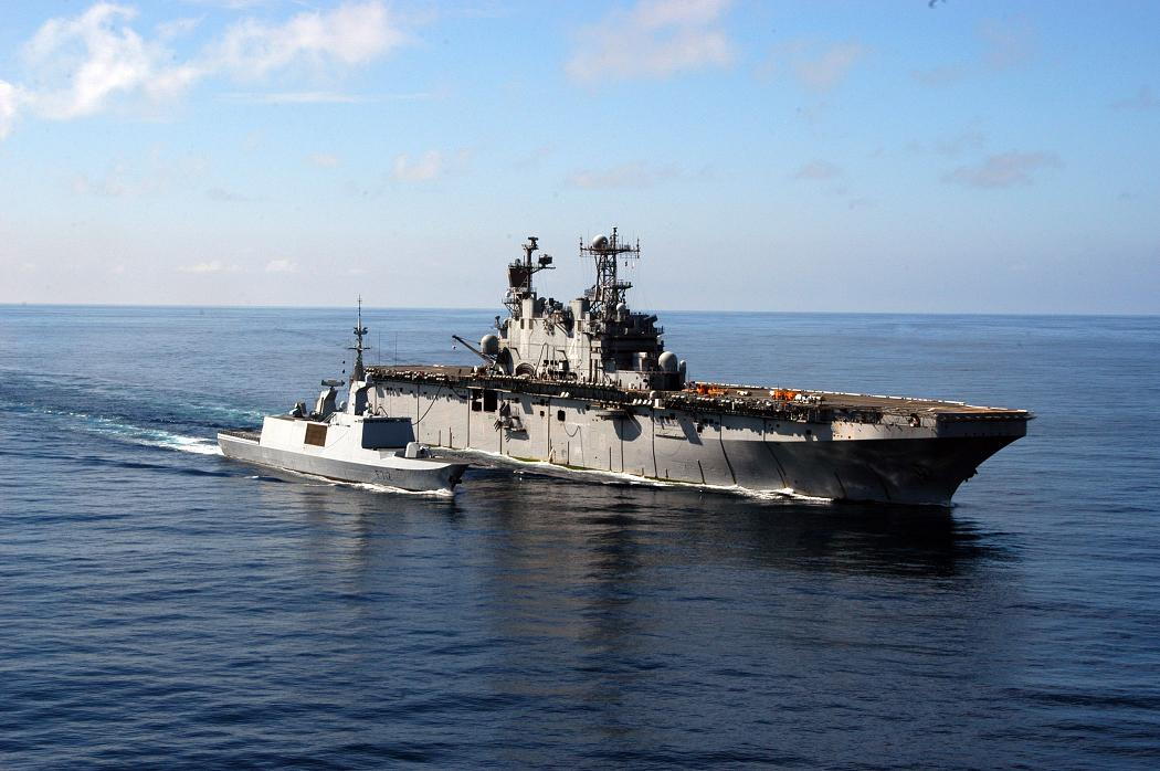 Le navire d’assaut amphibie USS Nassau (LHA 4) effectue un ravitaillement à la mer avec la frégate française Courbet (F 712). Le Nassau est déployé en Océan Indien comme navire amiral du groupe expéditionnaire de frappe n° 8 [1] soutenant des opérations de sécurité maritime dans la zone d’opération de la 5ème flotte américaine.