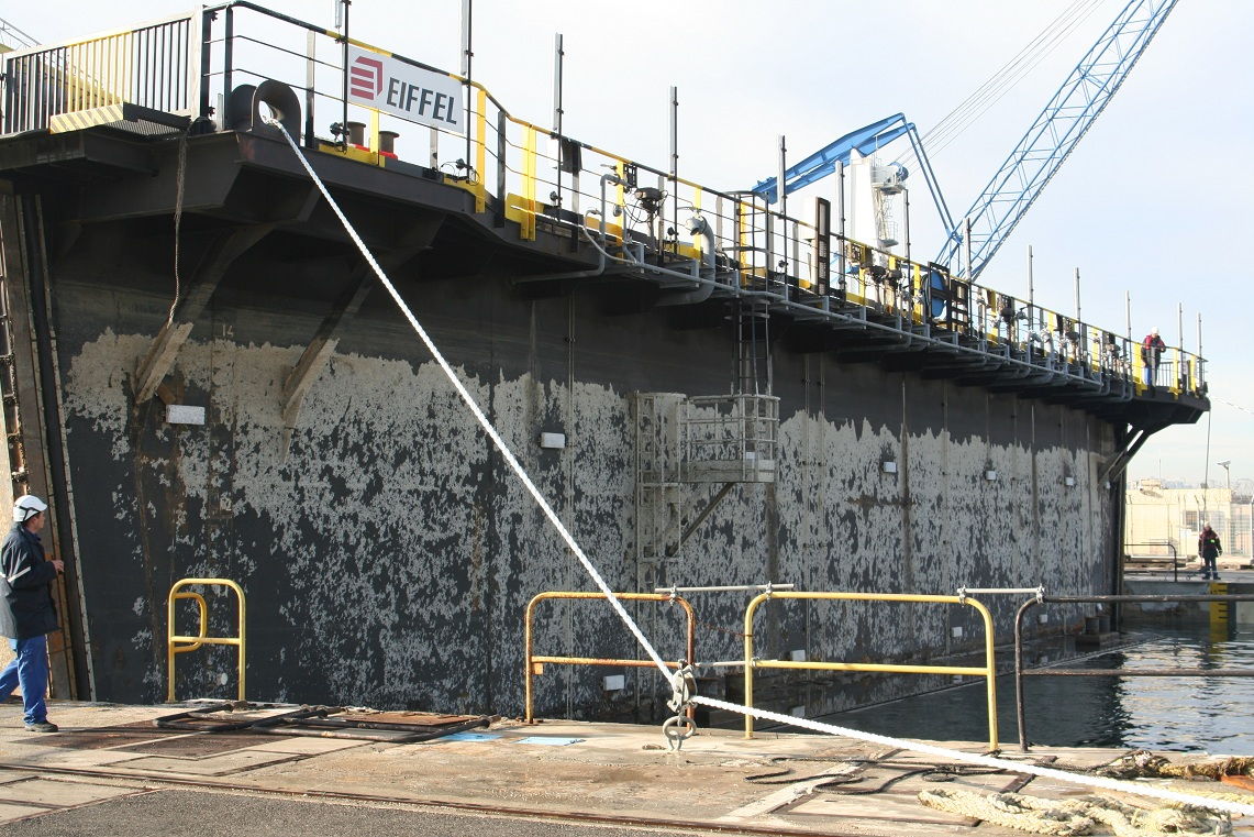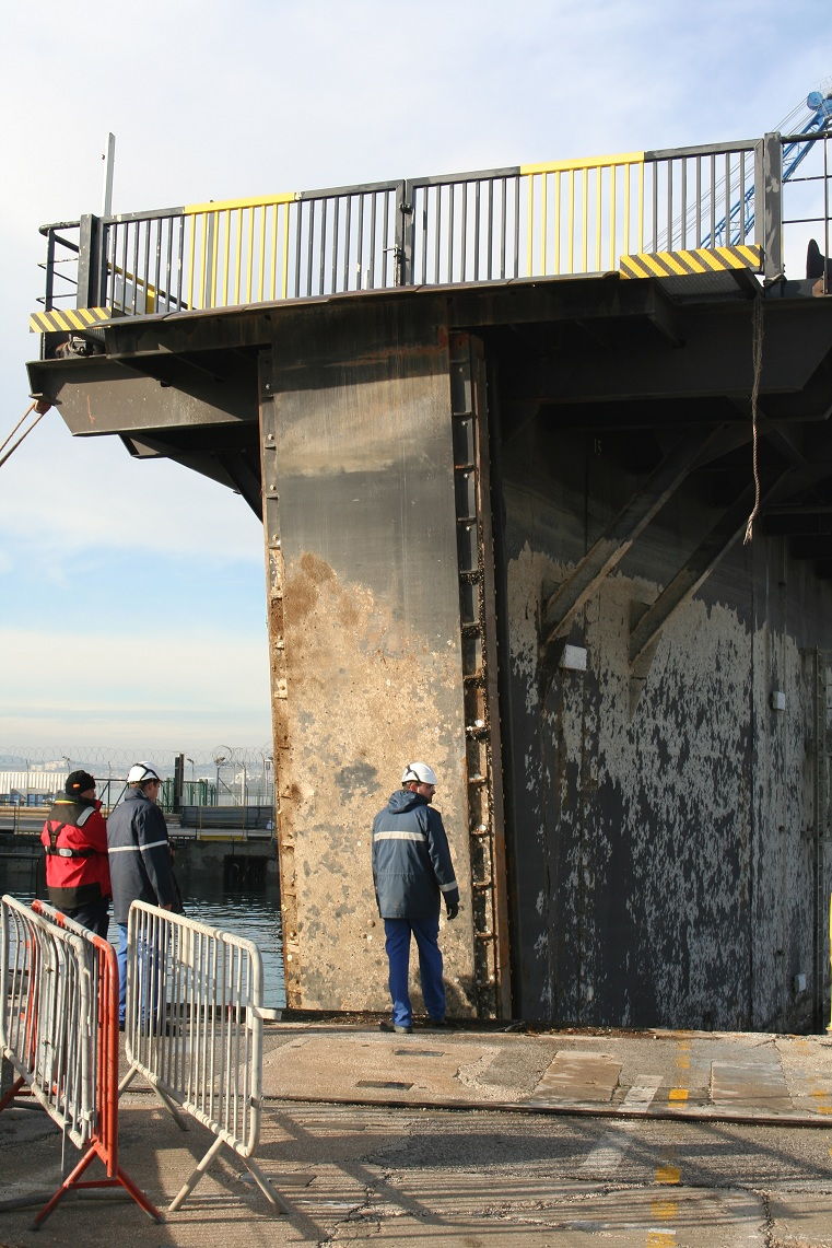 Les 2 portes du bassin, en réalité des bateaux-portes, ont ensuite été mises en place. Dans les prochaines heures, des plongeurs vont brancher les différentes servitudes — principalement, l’alimentation en eau de mer de certains équipements du porte-avions qui continueront à fonctionner, même bassin à sec. Ensuite commencera la vidange du bassin.