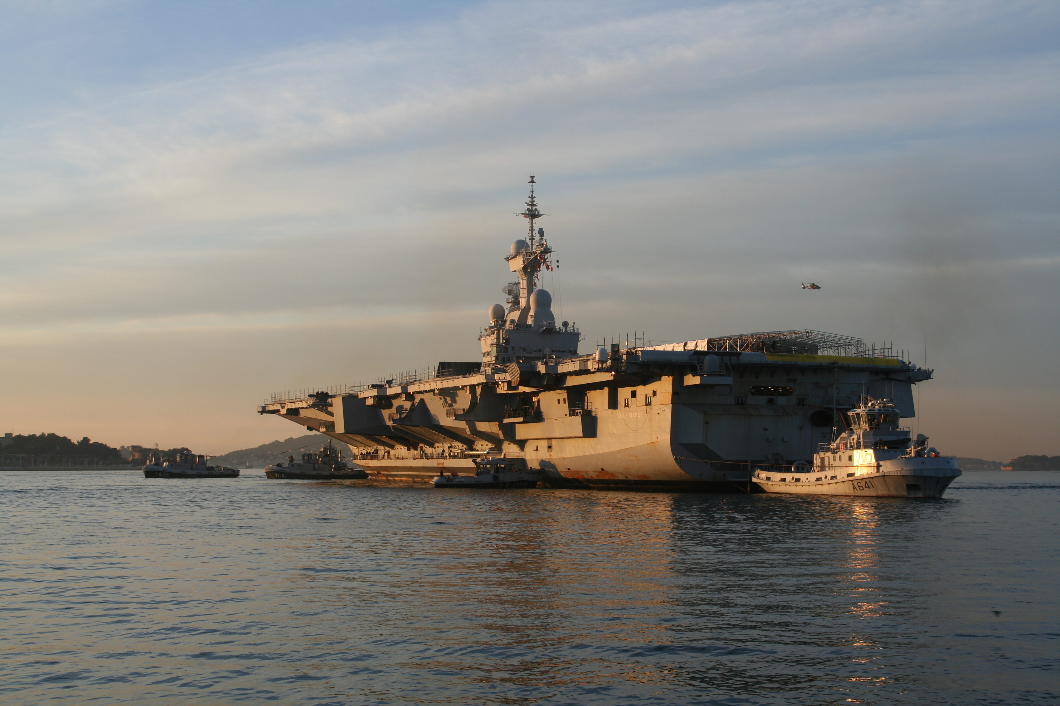 Profitant d’une fenêtre météo favorable, avec un vent très faible, les moyens portuaires de la base navale de Toulon et DCNS ont fait entrer le porte-avions nucléaire dans le bassin Vauban, à peine plus long et plus large que celui-ci.