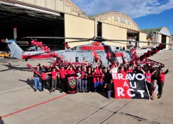 A l’occasion de la finale du Top 14 qui verra s’affronter Toulon et Castres au stade de France samedi 1er juin, la Flottille 31 F de la Marine nationale implantée sur la Base Aéronautique Navale de Hyères, s’est mobilisée aux couleurs Rouge et Noir du RCT devant le dernier hélicoptère de la Marine nationale, « le Caïman marine ».