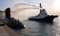 Cette image prise le 26/10/10 et rendue publique par la marine chinoise le 27/10/13, montre un sous-marin nucléaire chinois participant à un exercice de sécurité nucléaire dans la base de Qingdao.