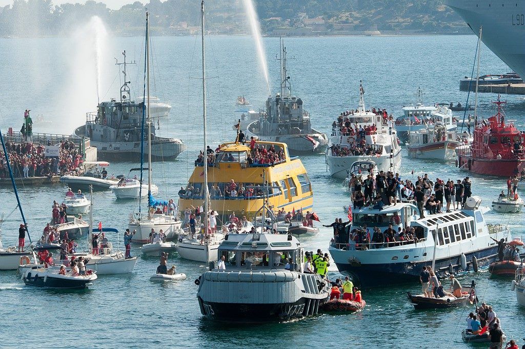 Deux remorqueurs de la base navale ainsi que la vedette des marins pompiers de Toulon ont accompagné sur l’eau l’entrée du RCT dans la rade sous les grandes eaux. C’est en arrivant à quai qu’une haie d’honneur formée par des marins était présente pour accueillir toute l’équipe avec en tête le bouclier de Brénus porté par Jonny Wilkinson et Mourad Boudjellal .