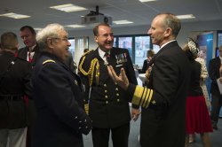 Une réception organisée avant la cérémonie de mise à l’eau du porte-avions HMS Queen Elizabeth, a été l’occasion d’une rencontre informelle entre l’amiral Rogel, chef d’état-major de la marine nationale, le secrétaire américain à la marine, Ray Mabus, et ses homologues américain, l’amiral Greenert, et britannique, l’amiral Sir George Zambellas.