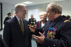Le secrétaire américain à la marine, Ray Mabus, sourit en écoutant le chef d’état-major de la marine, l’amiral Bernard Rogel, lors de la réception.