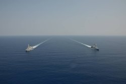 Le « Forbin » a ainsi pu croiser à la mer son sistership le « Chevalier Paul ». Outre le plaisir de naviguer ensemble en haute mer et d’être déployés simultanément en opérations, cette rencontre a permis la réalisation de mouvements logistiques entre les deux bâtiments.