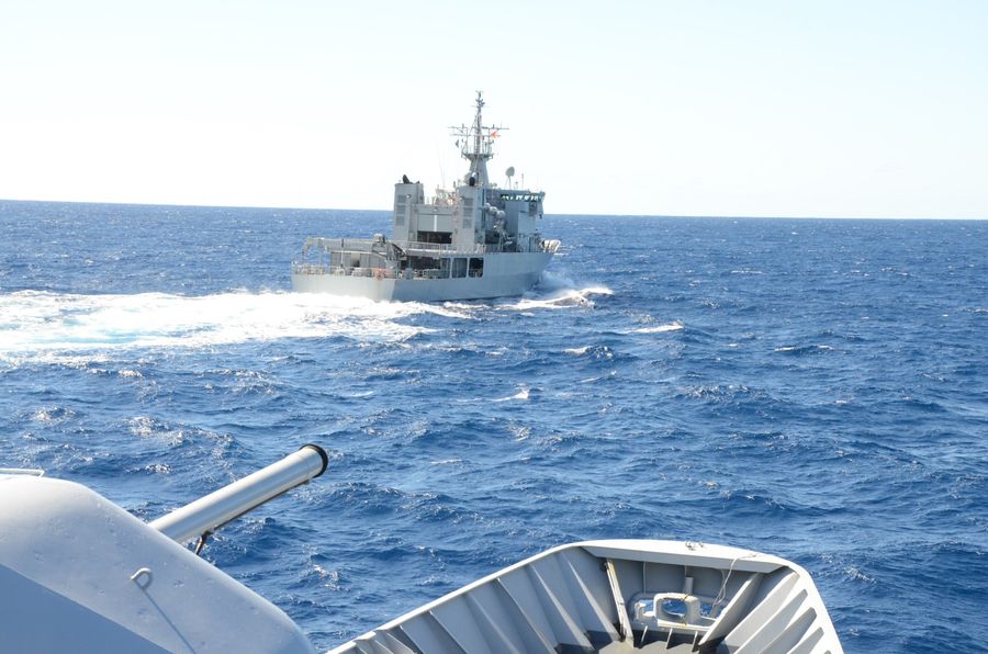 Le bâtiment ravitailleur de forces Jacques Chevallier ravitaille la frégate espagnole Mendez Nuñez