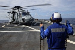 Avec la participation du destroyer américain USS Ross au groupe aéronaval, c’est l’occasion pour l’hélicoptère Caïman de se poser sur ce bâtiment. L’US Navy a publié des photos de l’appontage et de son ravitaillement.