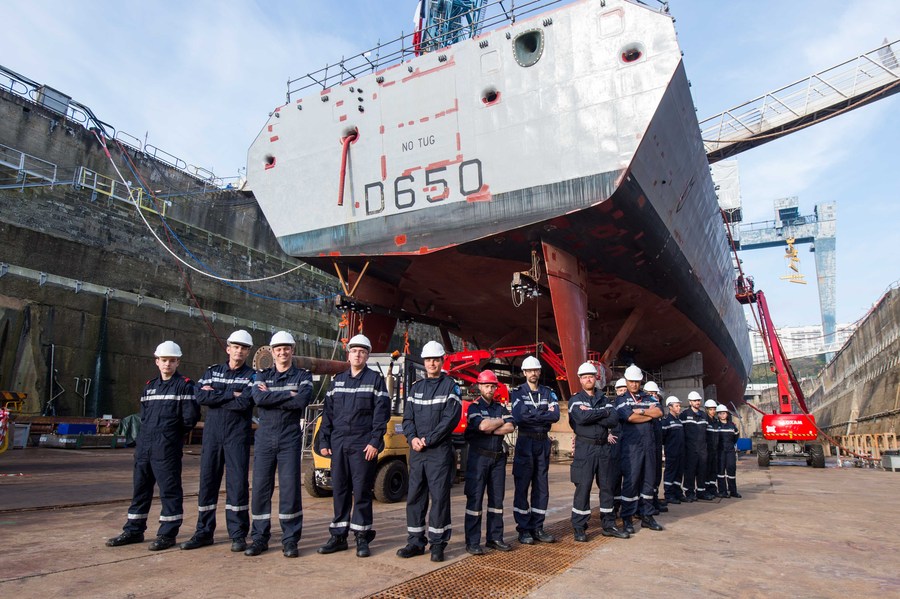 A La Réunion, le chantier naval Piriou débute avec le bâtiment de soutien Champlain un premier arrêt technique sur le dock flottant