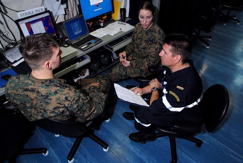 Le Sgt. Ryan Phelan et le 1er Lt. Arianne Boldizar discutent des opérations de la coalition avec le MP Pascal Gonzalez du porte-avions français Charles de Gaulle au centre de renseignement du porte-avions américain USS John C. Stennis. Photo U.S. Navy, Paul J. Perkins, tous droits réservés
