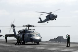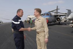 Le commandant de la Task Force 473, le contre-amiral français Xavier Magne, et 15 autres officiers du Charles de Gaulle ont rencontré leur homologues du John C. Stennis pour diner, une visite du navire et l’opportunité de discuter de l’intégration et de l’interopérabilité entre les 2 groupes de porte-avions.