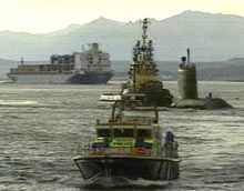 Le HMCS Chicoutimi, lors de son remorquage jusqu’au port de Faslane après l’incendie. (Archives)