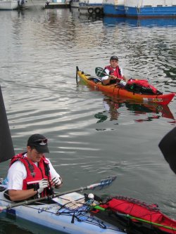 Après un certain temps d’attente, les spectateurs ont aperçu un kayak bi-place s’avancer dans le port. Fausse alerte : ce n’est pas les 2 champions, mais des amis venus leur souhaiter bon voyage et les accompagner pour le départ.
