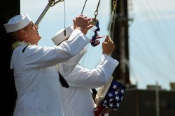 Le pavillon et la flamme de guerre de l’USS Hawaii ont été hissés samedi, moment à partir duquel le sous-marin a commencé à faire officiellement partie de la Navy. © Star Bulletin