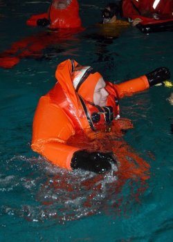 “Nous faisons cet entraînement parce que notre sous-marin vient juste de recevoir les combinaisons MK-10 à la place des anciennes,” a déclaré Nicholas Sharp, un électricien du Michigan. “Je pense que ces combinaisons sont beaucoup mieux que les précédentes parce qu’elles vous gardent au sec, ce qui augmente les chances de survie.”