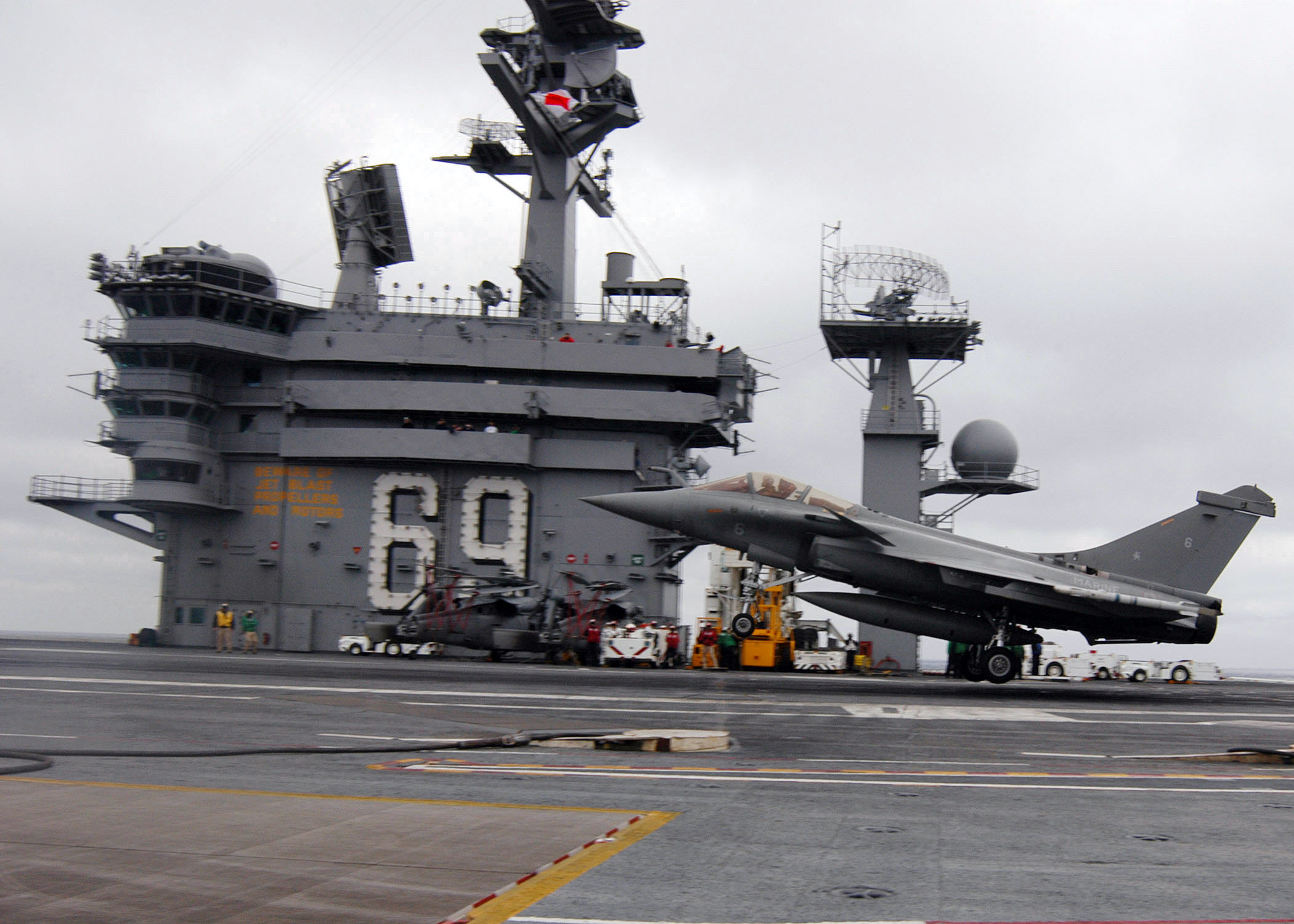 Un Rafale de la Marine Nationale du Charles De Gaulle effectue un touch-and-go à bord du porte-avions américain USS Dwight D. Eisenhower. (photo US Navy).