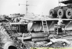 Il a obtenu l’autorisation du directeur du chantier de démolition d’aller à bord pour ses photos, photos en noir et blanc qu’il développait le soir dans sa cuisine. Il a aussi pû survoler le PA en hélicoptère pour photos.