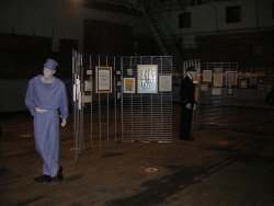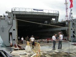 La première chose que l’on remarque en embarquant à bord, c’est la profondeur du radier (plus de 100 m de long). C’est là, après que le bâtiment ait ballasté qu’entrent les chalands de débarquement. Et c’est tout au fond du radier, que ce trouvait ce vendredi la première attraction : une exposition d’articles de journaux et de photos faisant le parallèle avec la BD Tramp.