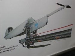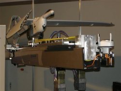 Le système de lancement Volans et un drone Aladin modifié (une aile repliée, l’autre déployée pour la démonstration) lors d’une récente exposition à Berlin. © Joris Janssen Lok