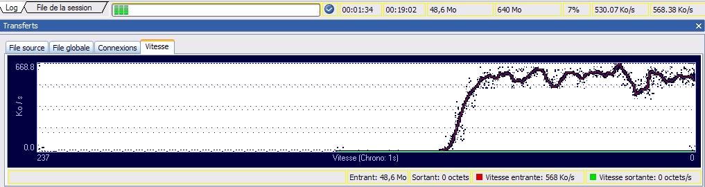 Test effectué avec SmartFtp. Moyenne à 530.07 ko/s avec des pointes à 668 ko/s. Image prise au bout d’1’34" de téléchargement.