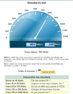 Pour effectuer une bonne mesure, il faut : – utiliser un serveur le plus proche possible (en terme d’internet, on ne parle pas ici de situation géographique) : le mieux est d’utiliser un serveur de votre FAI. – utiliser un serveur de grande capacité. – effectuer la mesure sur un temps long : 1 minute environ, – utiliser un logiciel visualisant la vitesse instantannée et non la moyenne, – si vous utilisez un réseau local (avec routeur), sachez que le routeur peut "consommer" une partie de la bande passante. La vitesse mesurée sera inférieure de quelques % à la vitesse atteinte sans le routeur (cela peut atteindre 10 à 20%). Ne laissez démarré que l’ordinateur sur lequel vous effectuez la mesure afin d’être certain que les autres ordinateurs ne prennent pas une partie de la bande passante. – Pensez à effectuer la mesure sur différents ordinateurs connectés au réseau local : j’ignore pourquoi il arrive que les résultats soient différents alors que les réglages réseau sont les mêmes. – et surtout : arrêter tous les autres programmes (qu’ils utilisent la liaison ou pas). A chaque paquet reçu, votre ordinateur doit répondre : s’il est occupé à autre chose, la vitesse en sera affectée. Sur une liaison très rapide (4 Mo/s), l’ouverture d’un dossier a fait chuter la vitesse de 80%.