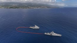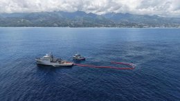 Exercice grandeur nature au large de Faa'a. Le Bougainville a entraîné son équipage à affronter une situation de pollution marine. Un barrage (…)